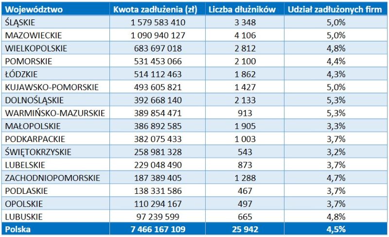 • Polski przemysł najbardziej zadłużony jest w woj. śląskim z łączną kwotą sięgającą prawie 1,6 mld zł niespłaconego długu.