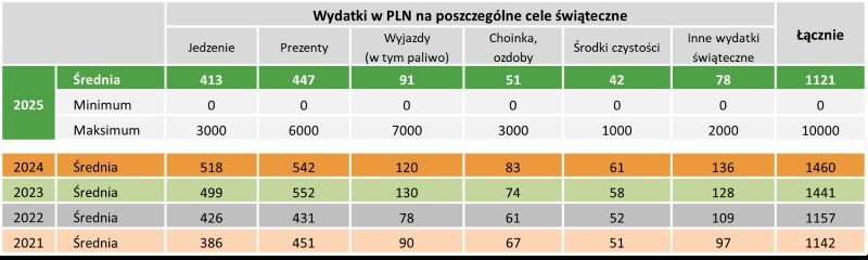 Na podstawie kwot wskazywanych dla konkretnych kategorii wydatków świątecznych stwierdzić można, że Polacy w tym roku wydadzą o ponad 23 proc. mniej niż w ubiegłym roku. Największa część tej kwoty przypada na prezenty świąteczne (średnio 447 zł) oraz na jedzenie (średnio 413 zł).W porównaniu do roku ubiegłego, kwota przeznaczona na prezenty świąteczne spadła o 18 proc., a wydatki na jedzenie zmniejszyły się o ponad 21 proc. Rozpiętość wydatków jest duża – od 0 zł (osoby deklarujące, że nie wydadzą nic na dany cel) do nawet 7000 zł.