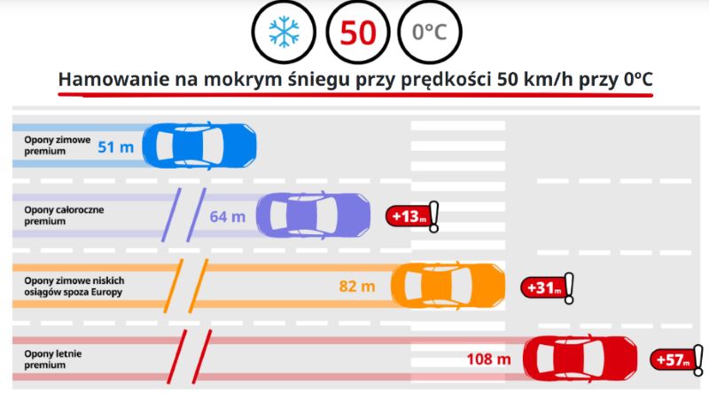 Jeśli jedziesz po śniegu na letnich oponach swoim autem (osobówką, SUVem czy vanem), także EV, także 4x4 – to ponad 50 metrów zabraknie, żeby zahamować przed uderzeniem. To znaczy, że nie ma prędkości bezpiecznej na letnich oponach na śniegu czy błocie pośniegowym. Po prostu ani kierowca, ani systemy samochodu nic z tym faktem nie zrobią przy braku przyczepności i szczątkowej sile tarcia.